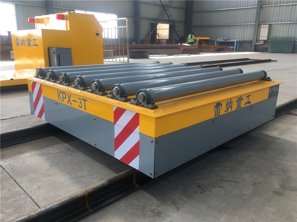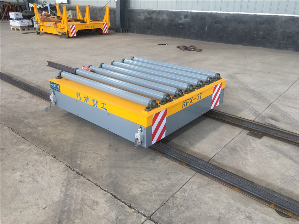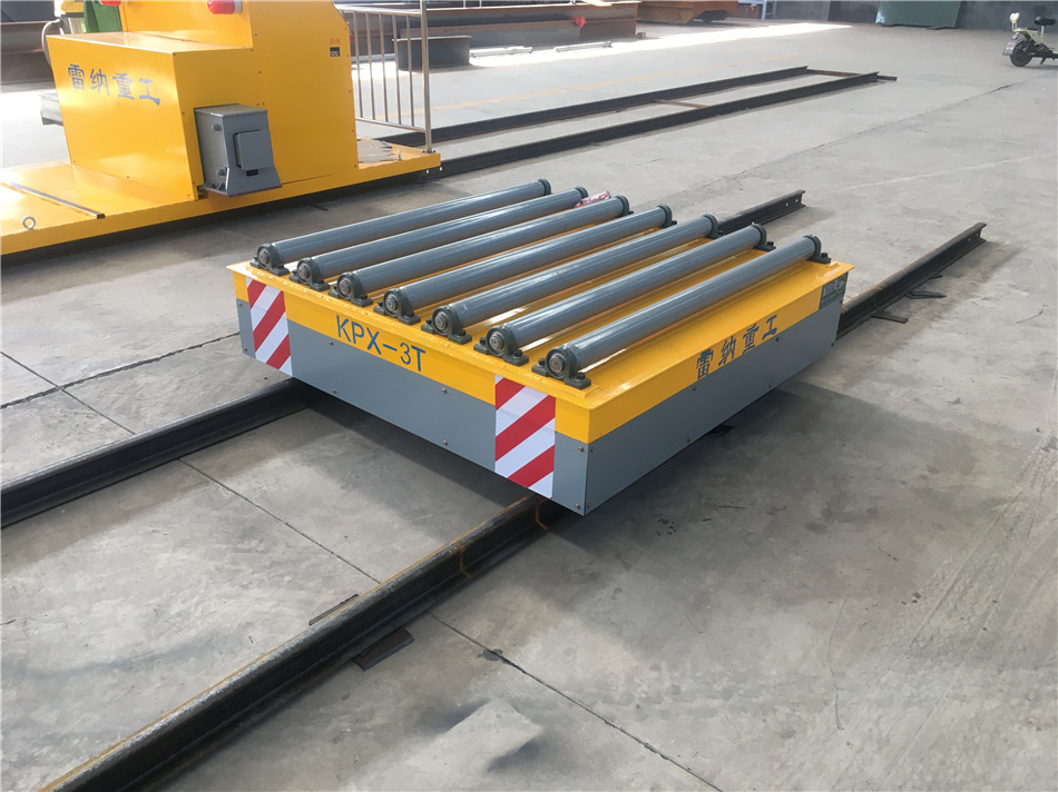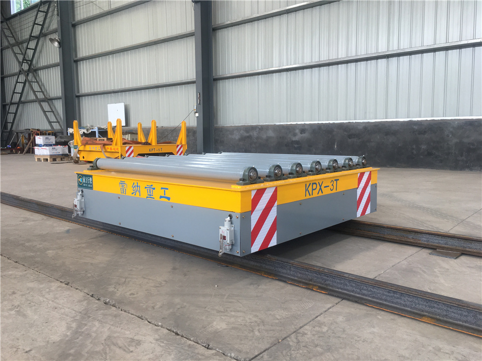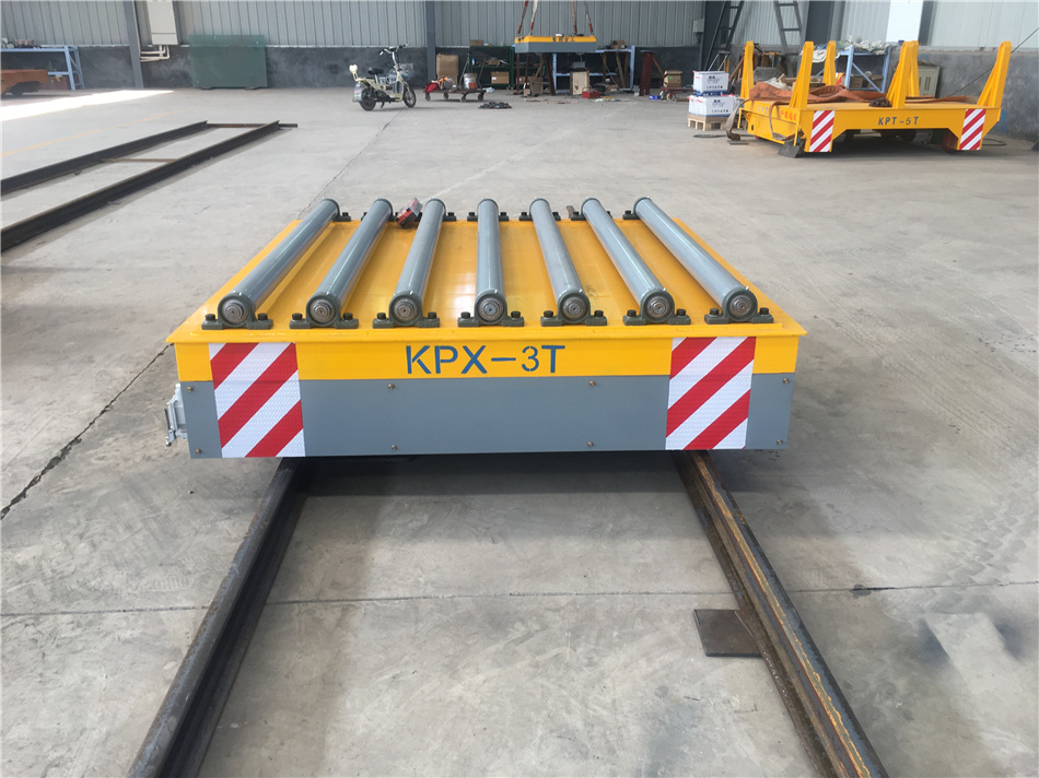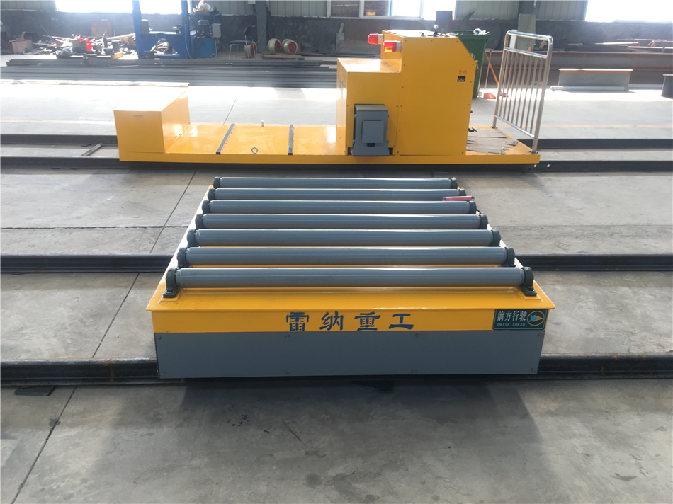 通過蓄電池供電驅動小車行進,車體兩端加裝有限位開關,可以很好地進行定位。軌道平車臺面有輥輪工裝,為了更好的滿足工作需求,利于裝卸貨。